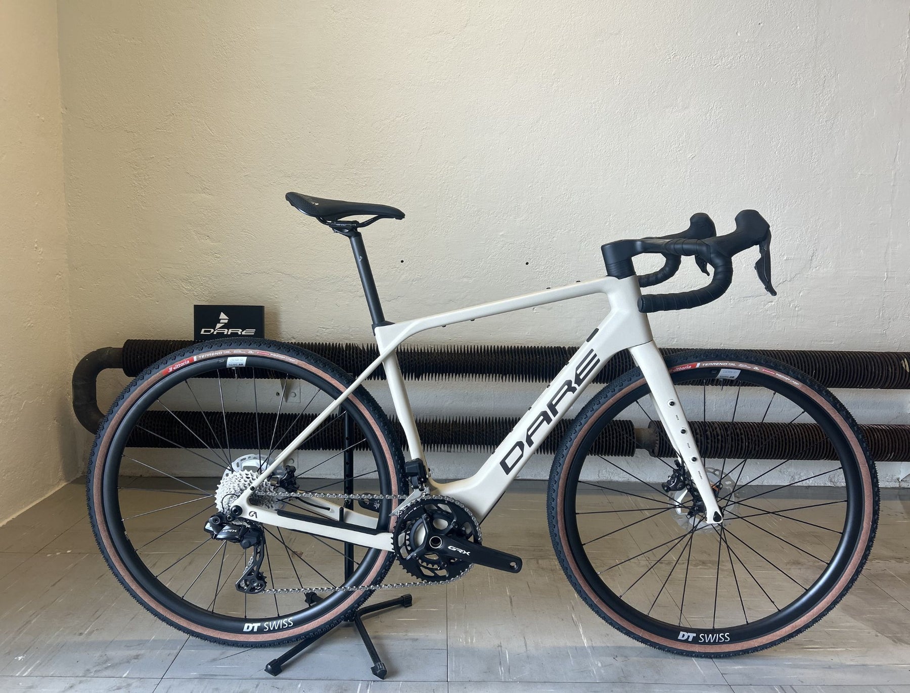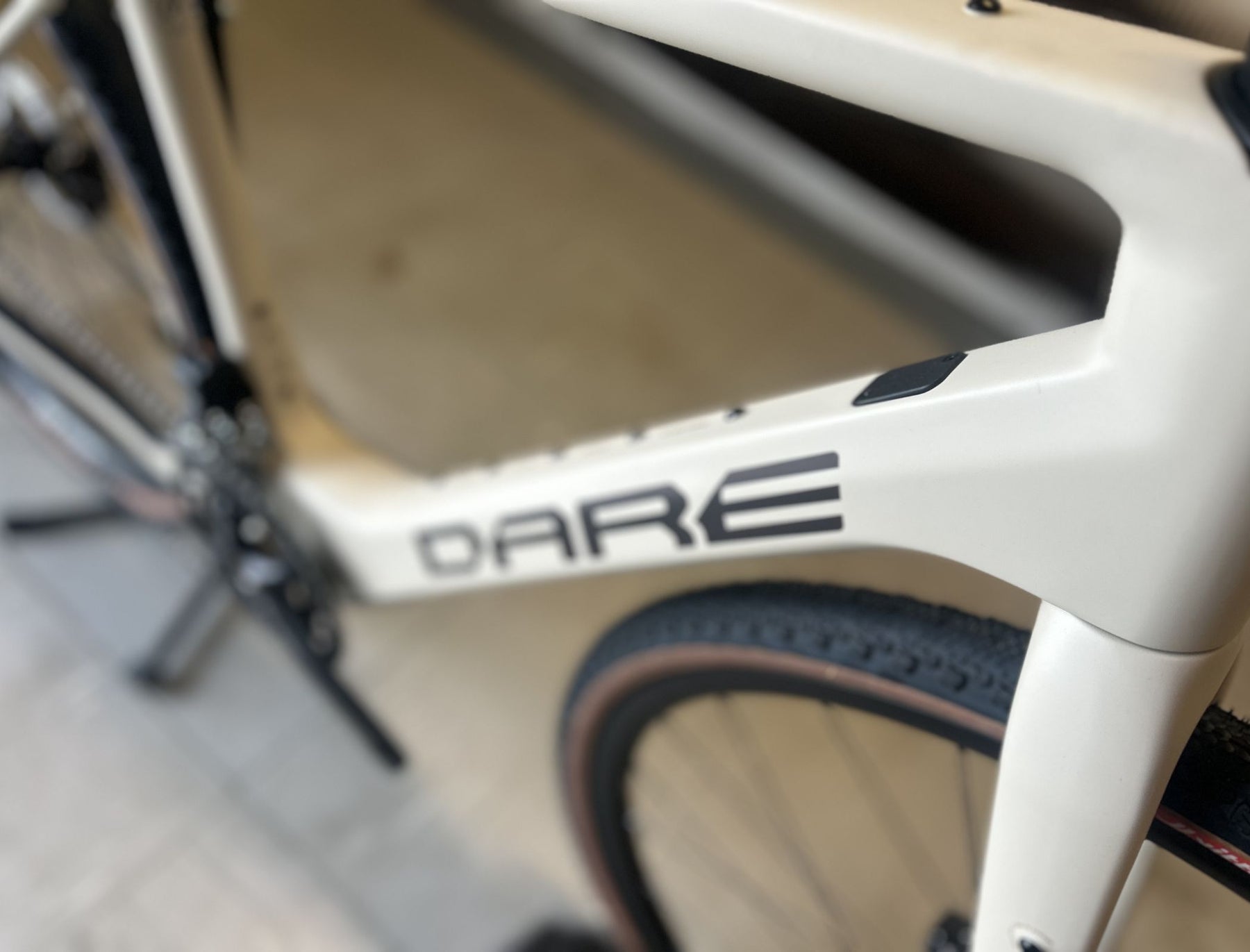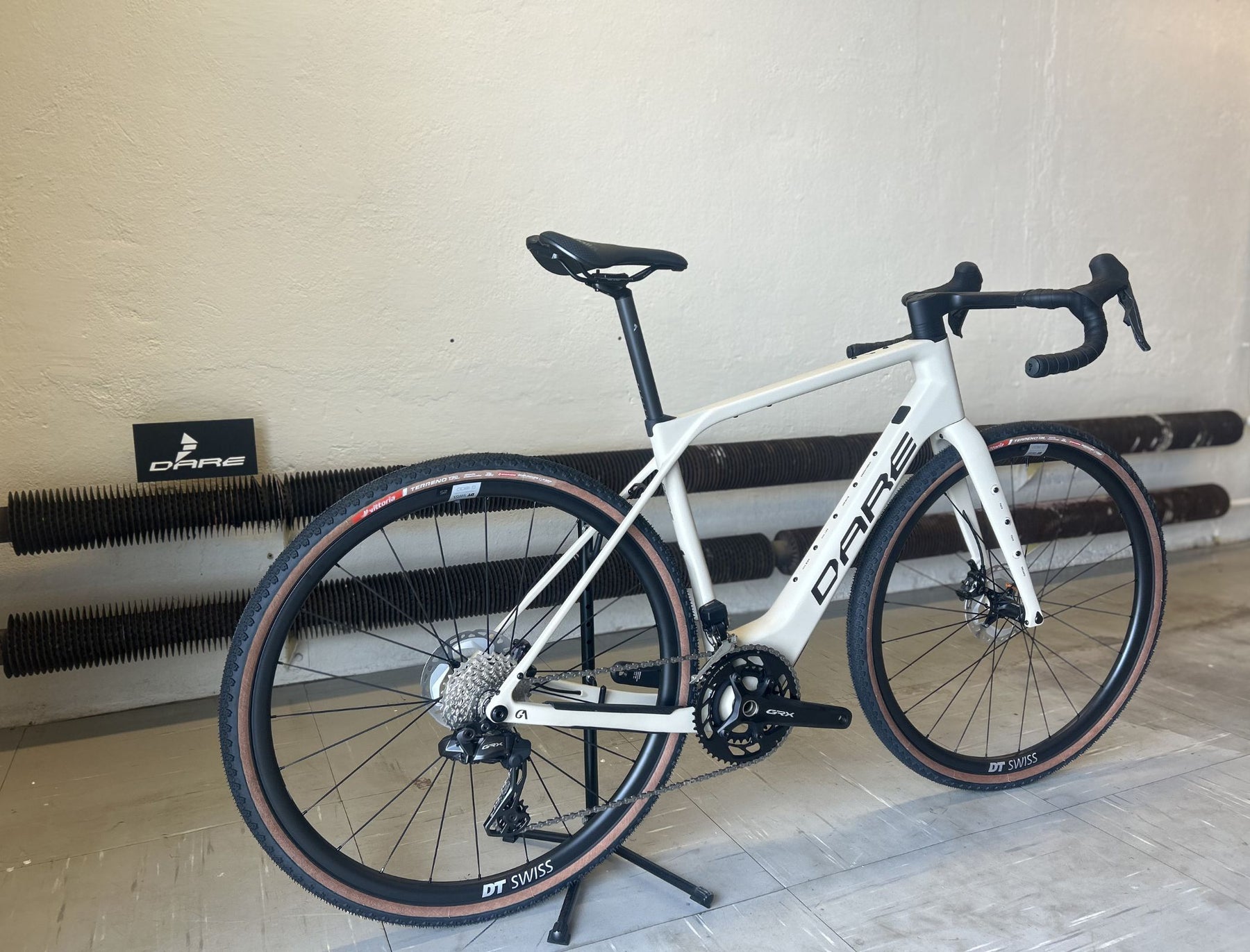 Fakta DARE GA i strl L. Fargen Barley White. GC:1 cockpit i karbon, strl 90mm stem, 420mm styrebredde. DARE Setepinne i karbon. Shimano GRX RX825 DI2 2x12 girgruppe. 172,5mm krankarmer, 48/31 krank og 11-34 kassett. Vittoria Terreno T30 dekk i 45mm bredde. Satt opp slangeløst. Selle Italia NOVUS BOOST EVO X-Cross SuperFlow, mangesium rails Pro Styretape.