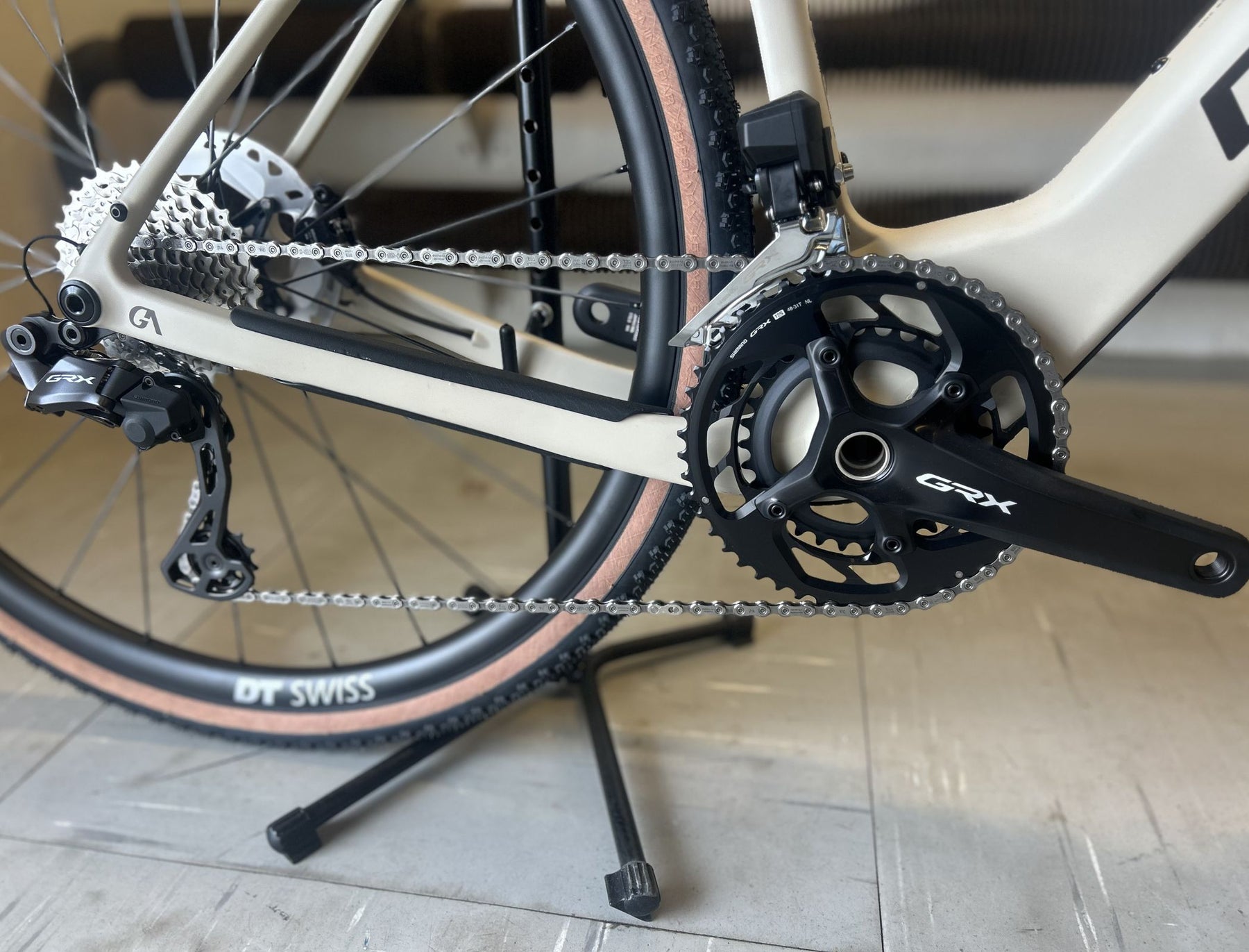 DARE Norge selger en GA Barley White i strl L, utstyrt med Shimano GRX Di2 2x12 girgruppe og G1800 aluhjul fra DT Swiss. Fin matt farge i Beige! Spesifikt one piece gravelstyre med flair i karbon i strl 90/420. Garminfeste følger med. Sykkelen har oppbevaringsrom i rammen der det følger med en veske i kul grønnfarge. Custom skjermer som tar det verste, enkle å ta av/på med en skrue. Rammen takler 50mm dekk og har flere festepunkter for vesker. Intern kabelføring og setepinne i karbon. Vittoria toppdekk i Terreno T30.