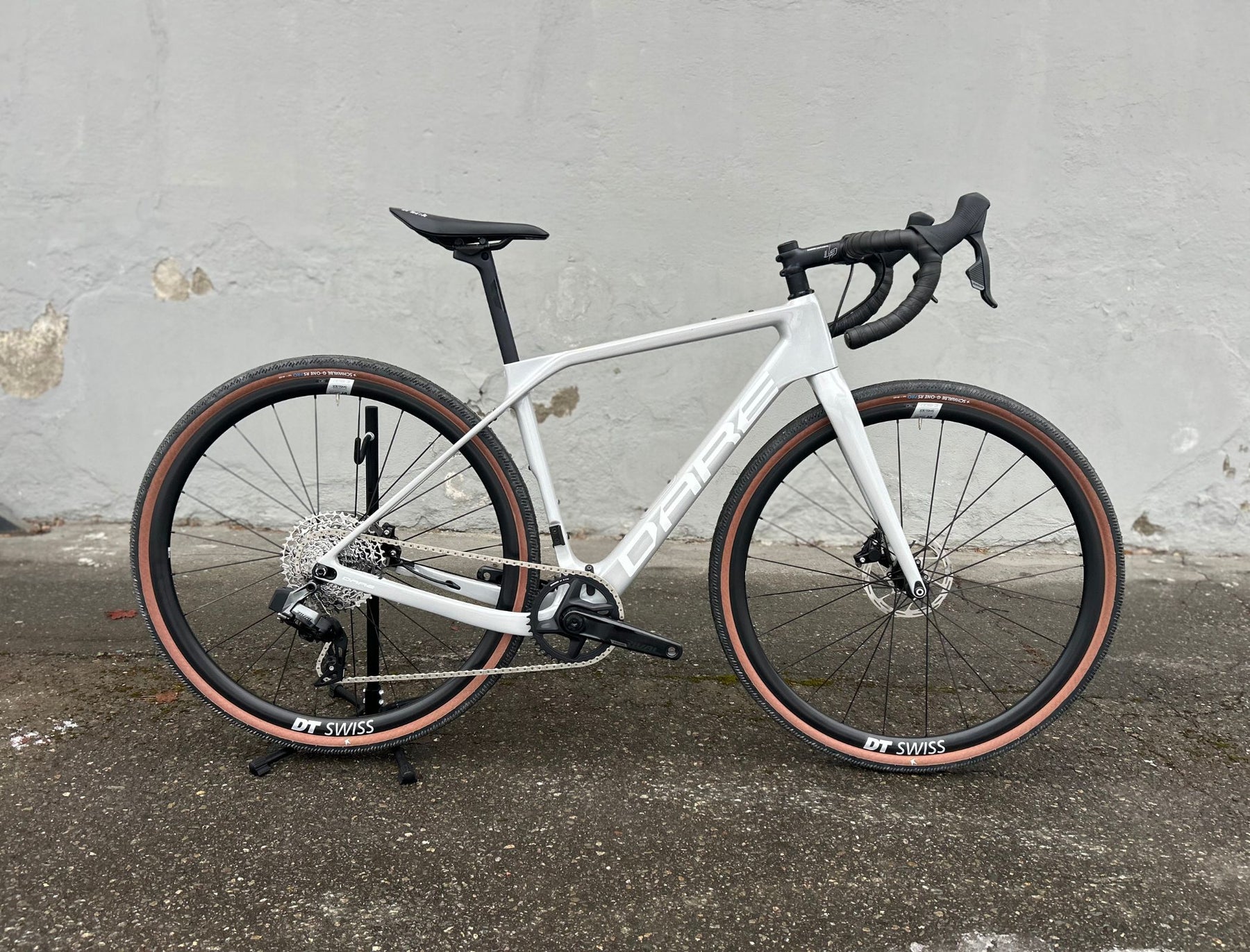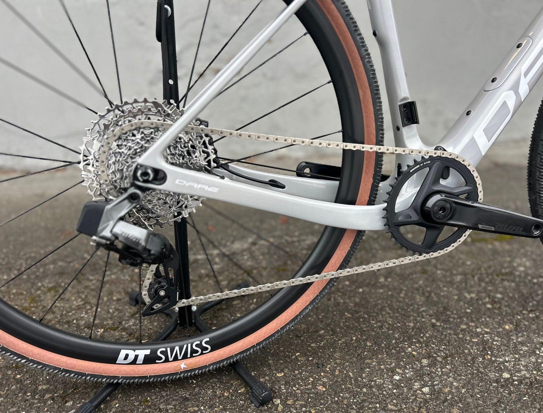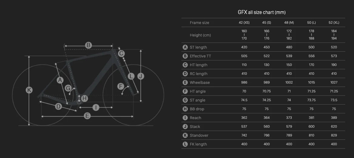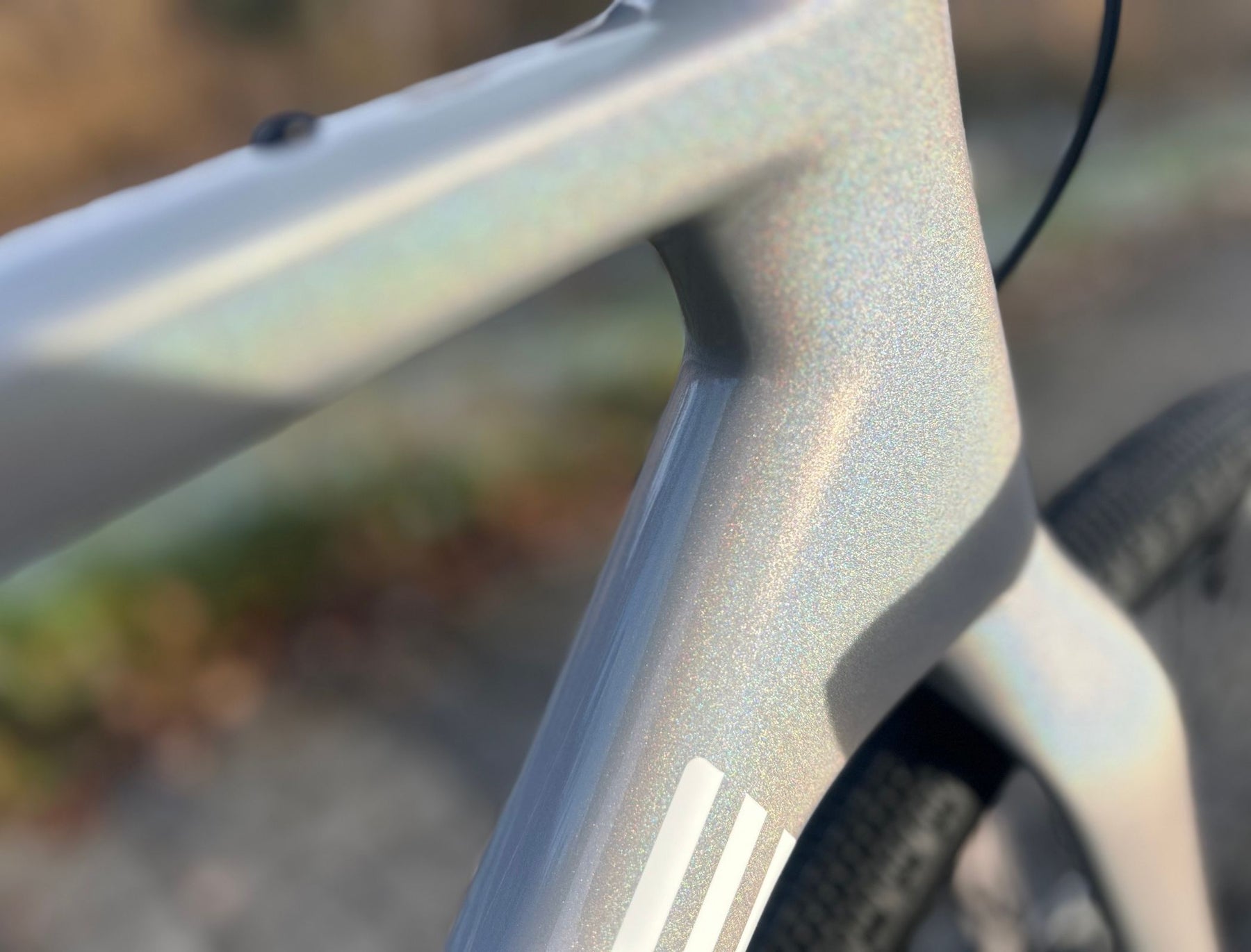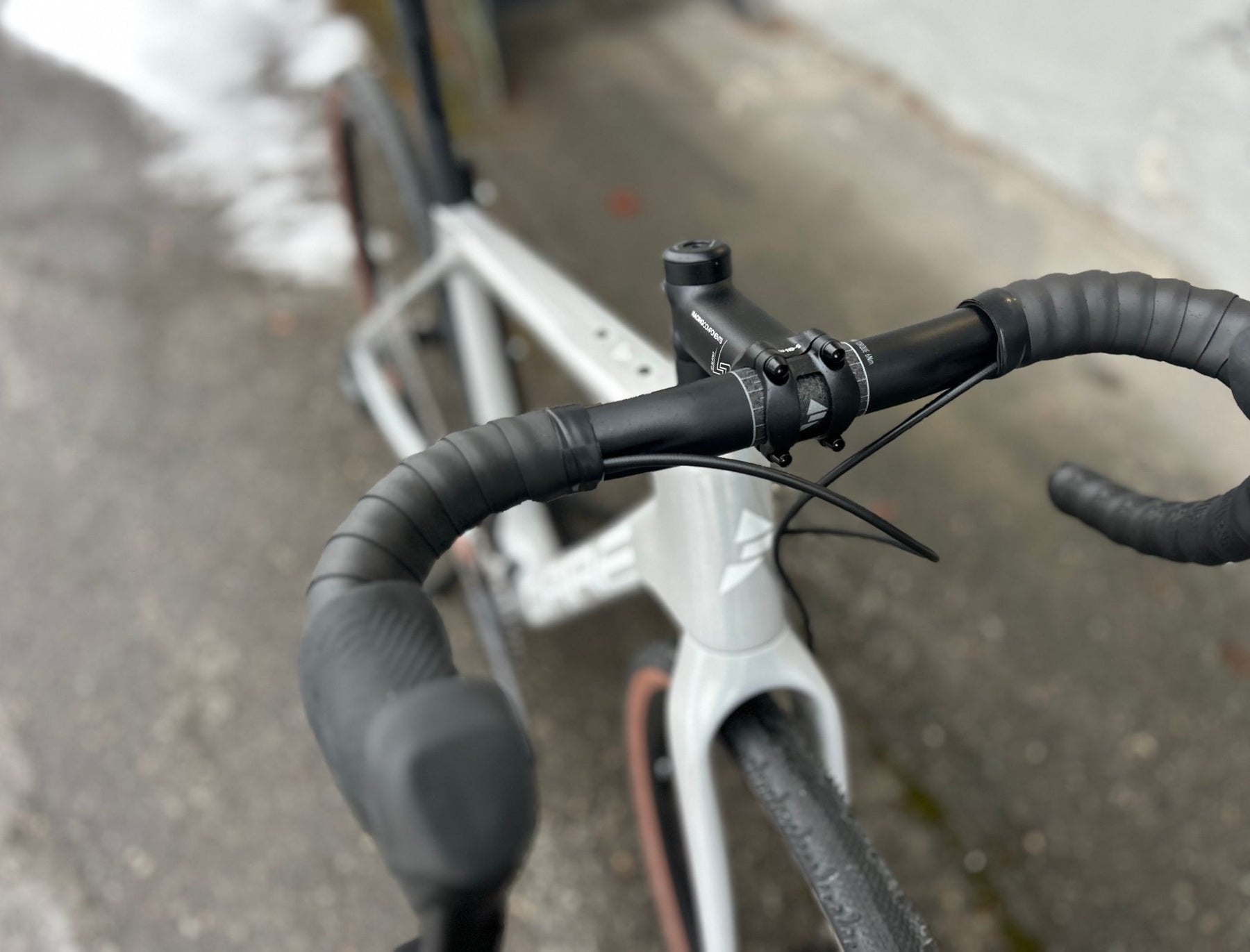 FAKTA Ramme: GFX i fargen Iridiscent Styre: Ergo karbon i 38cm bredde Gruppe: SRAM Rival Xplr elektronisk. 10-44 kassett og 40t drev. Hjulsett: DT Swiss E1800 Dekk: Schwalbe G-One RS 40mm Sadel: Fizik Vento Argo R5