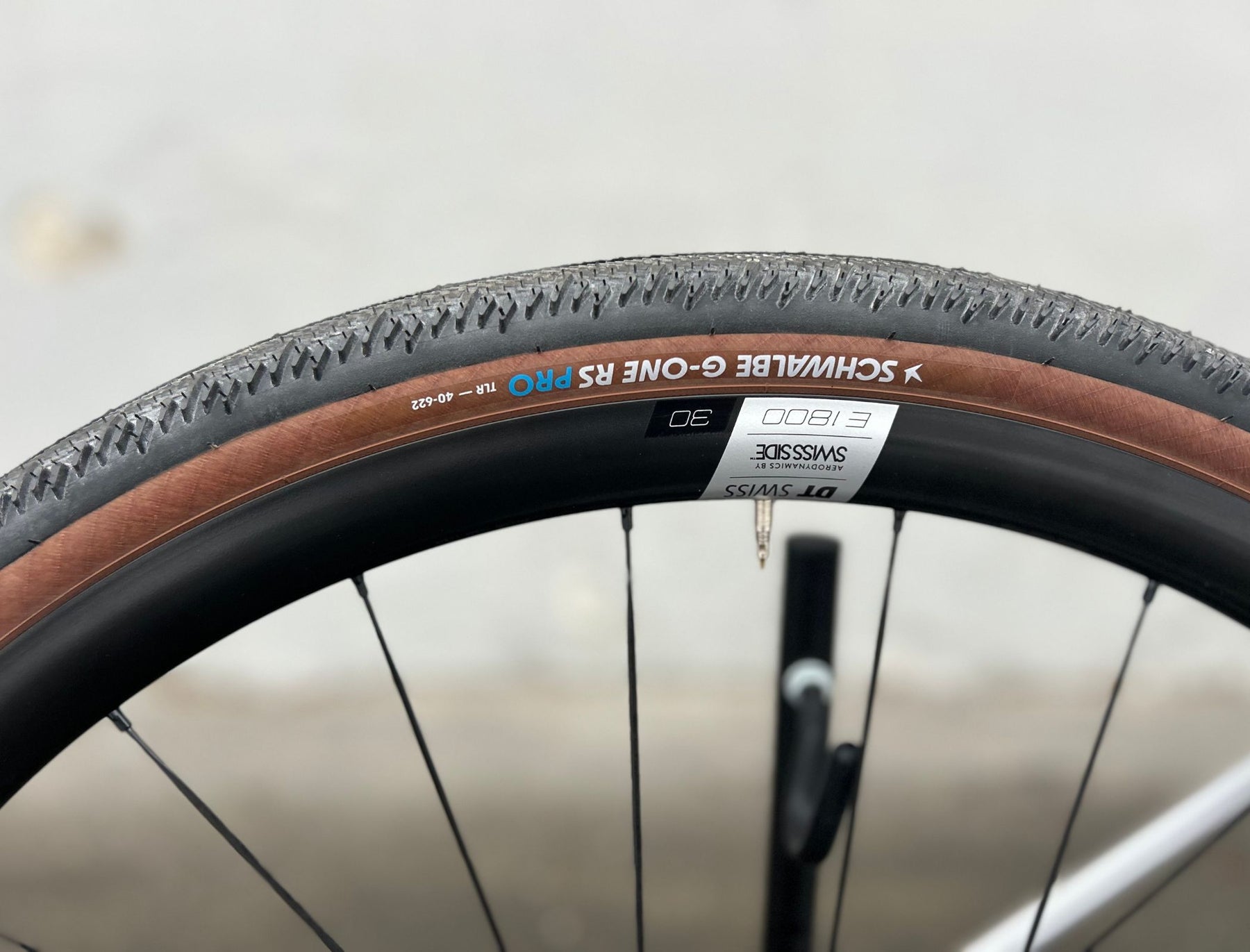 Toppdekkene G-One RS i 40mm bredde fra Schwalbe. Meget raske og lekre med brun sidevegg!
