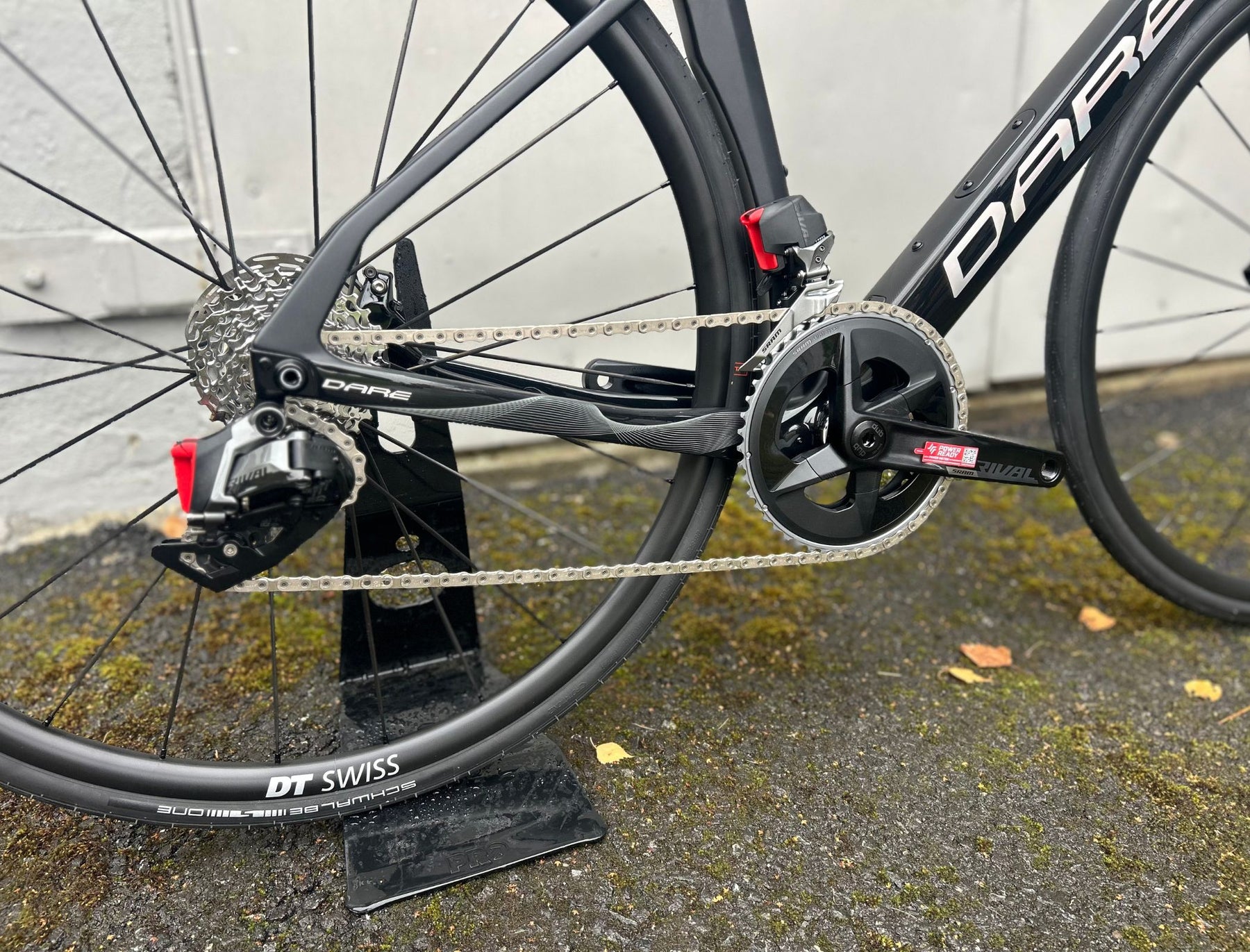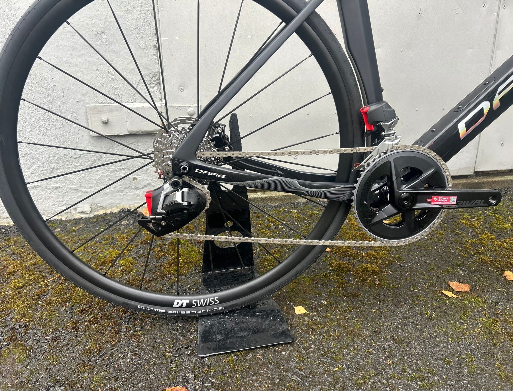 Spesifikasjoner: VSRu MY23 strl M i fargen Flash Black Aero1v cockpit I karbon Setepinne i karbon SRAM Rival eTap 2x12 gruppe. 48/35 krank og 10-30 kassett. Krankarm 170 mm lengde. Fizik Vento Argo R5 sadel. Schwalbe One 28mm dekk. DT Swiss P1800 23mm aluhjul