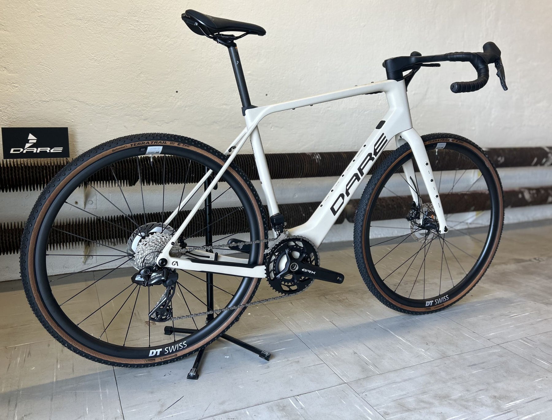 Fakta DARE GA i strl L. Fargen Barley White. GC:1 cockpit i karbon, strl 100mm stem, 440mm styrebredde. DARE Setepinne i karbon. Shimano GRX RX825 DI2 2x12 girgruppe. 172,5mm krankarmer, 48/31 krank og 11-34 kassett. Vittoria Terreno T30 dekk i 45mm bredde. Satt opp slangeløst. Selle Italia NOVUS BOOST EVO X-Cross SuperFlow, mangesium rails Pro Styretape.