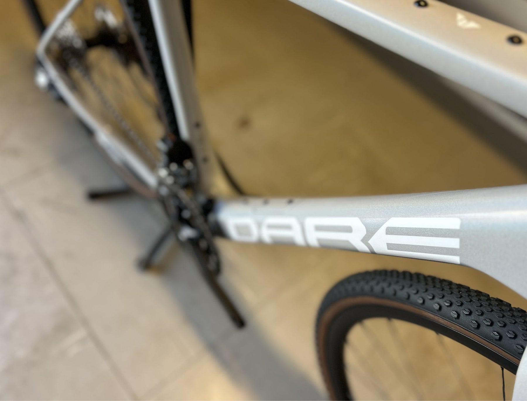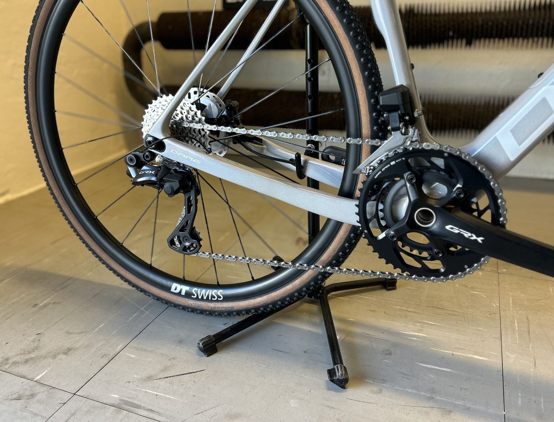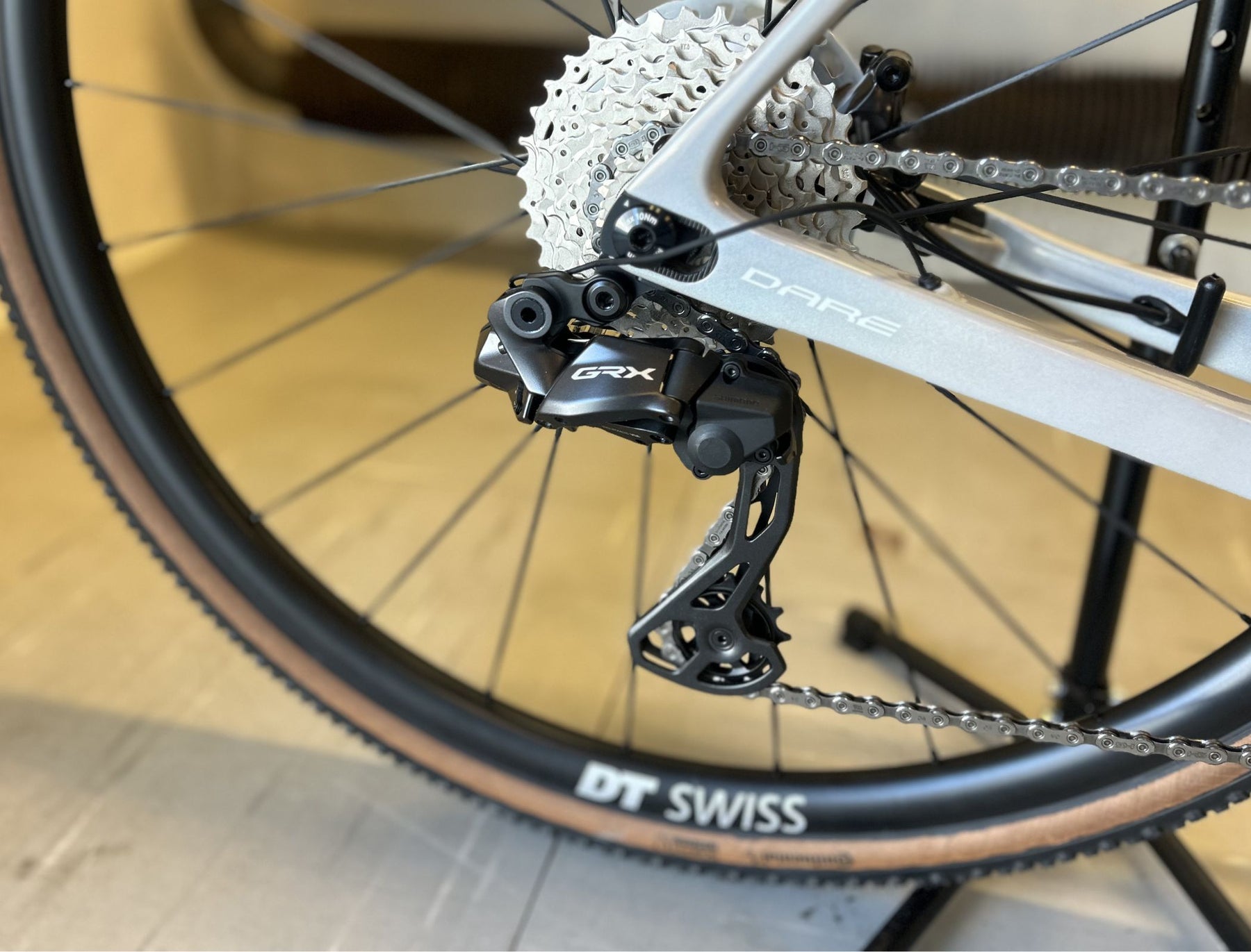 Spesifikasjoner: GFX i fargen Iridiscent DARE Aero1 cockpit 120mm lengde og 420mm bredde. Setepinne i karbon. Shimano GRX 2x12 DI2 gruppesett, 48/31 krank og 11-34 kassett Krankarm 172,5mm lengde. Prologo sadel. Continental Terra Trail dekk i 40mm bredde. Kan settes opp slangeløst.